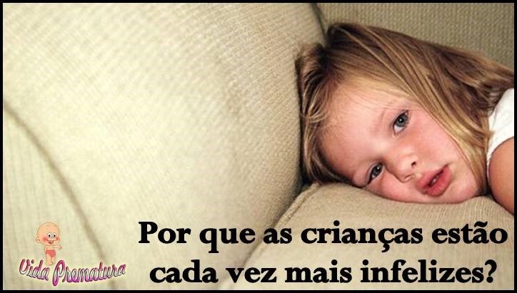 Uma em cada onze crianças com mais de oito anos de idade está infeliz, segundo um estudo divulgado em janeiro deste ano pela Children’s Society, organização centenária de proteção infantil. Apesar de a pesquisa trazer à tona uma realidade das crianças entre 8 e 16 anos do Reino Unido, especialistas brasileiros em saúde infantil afirmam que esse não é um problema exclusivo das crianças britânicas. No Brasil, a realidade é parecida. Ana Maria Escobar, pediatra do Instituto da Criança do Hospital das Clínicas, em São Paulo, conduziu uma pesquisa com os pais de cerca de 900 crianças de 5 a 9 anos que estudavam em escolas particulares e estaduais.